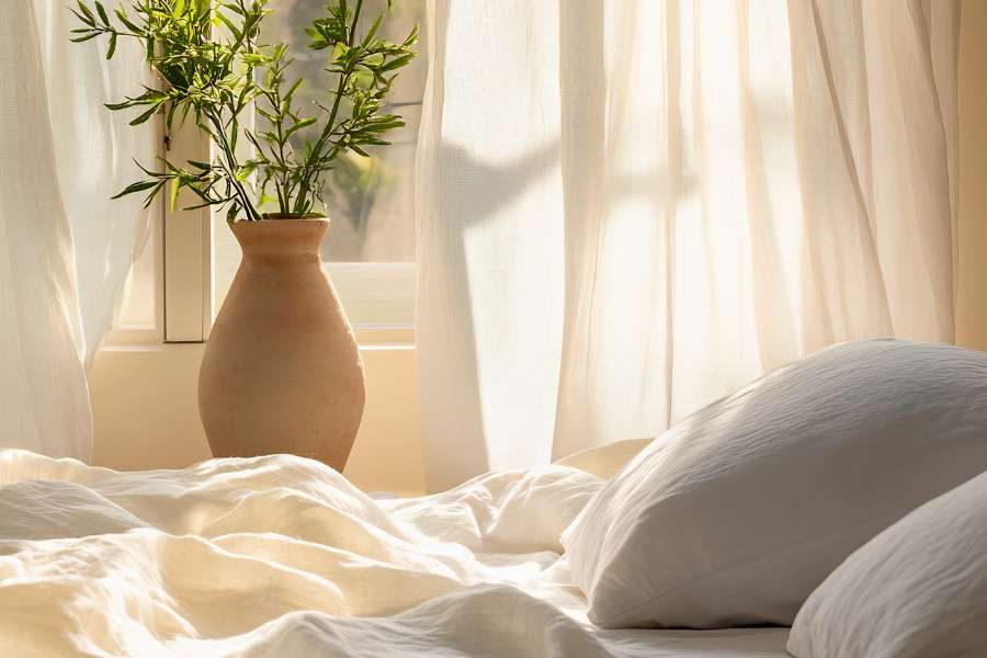 The moment you’re up, just open your windows and draw back your curtains, open your windows or balcony door, and let natural light and fresh air in.