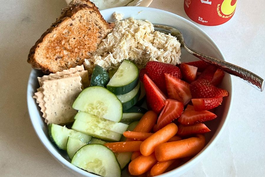 It can be pasta with roasted vegetables, peaches with burrata, or a perfectly chopped salad.